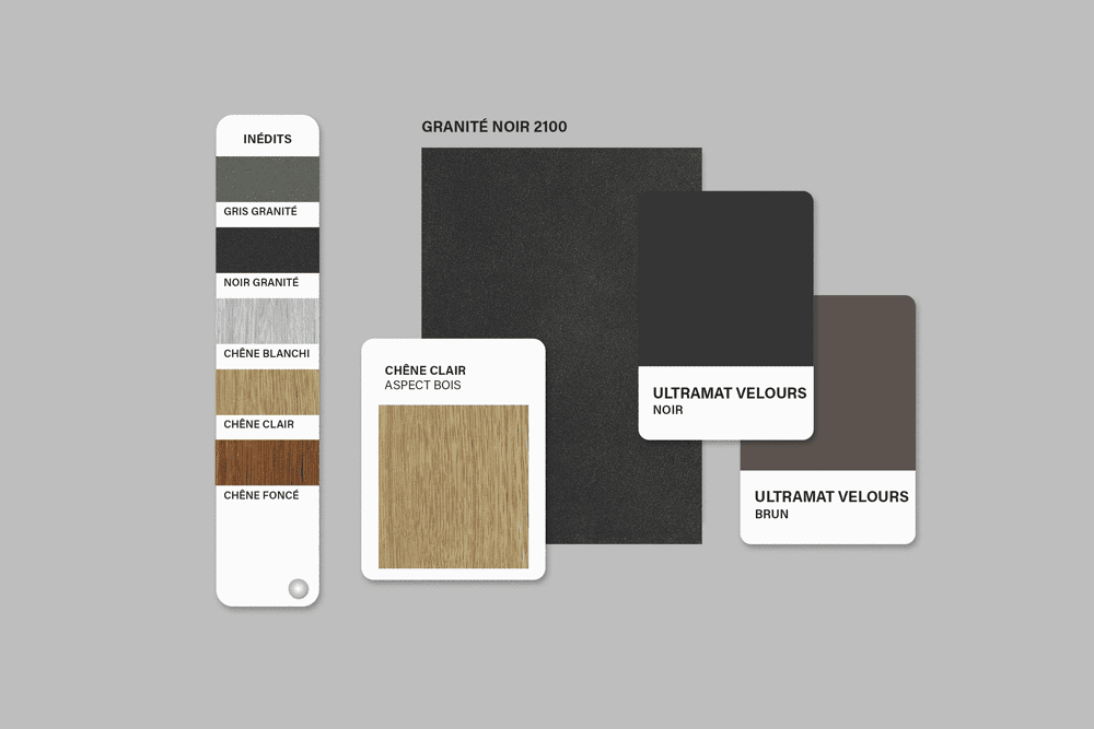 Arcades & Baies casse les codes du PVC classique avec une palette de finitions raffinées : noirs ou bruns mats à l’effet velours, textures granitées aux nuances intenses, imitations bois bluffantes (du chêne clair au foncé) et une grande variété de laques satinées ou sablées, disponibles en bi-coloration. Une personnalisation poussée, sans compromis sur la résistance dans le temps.